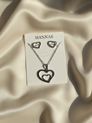 نیمست استیل دخترانه طرح قلب – رنگ ثابت نقره ای | گردنبند + گوشواره میخی