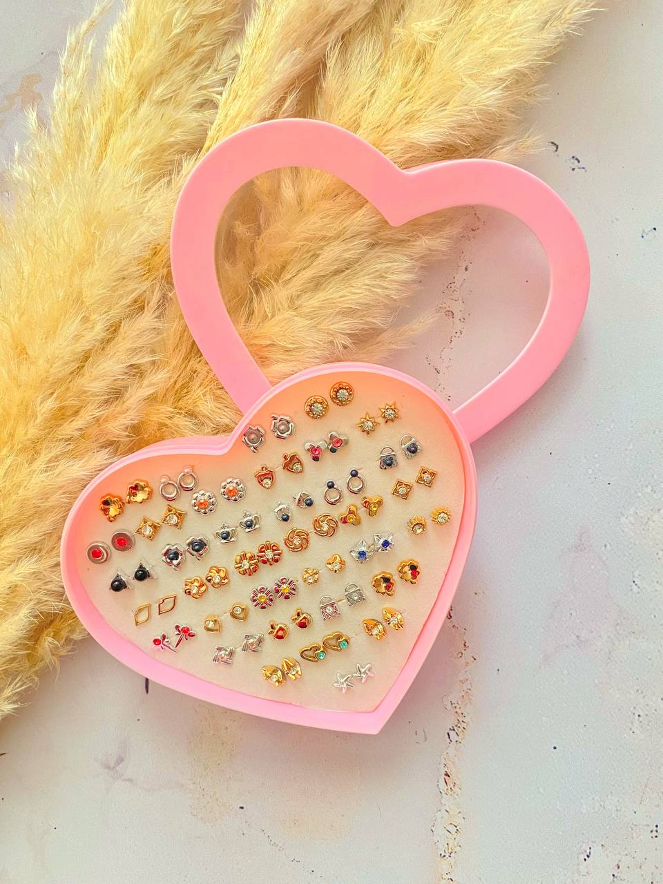 پک ۳۶ جفتی گوشواره میخی سیلیکونی ضد حساسیت دخترانه – باکس قلب صورتی ولنتاین