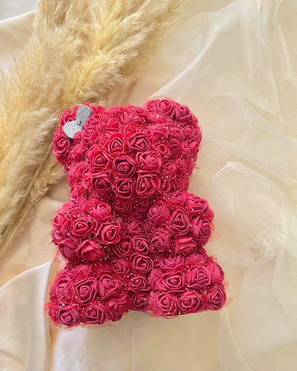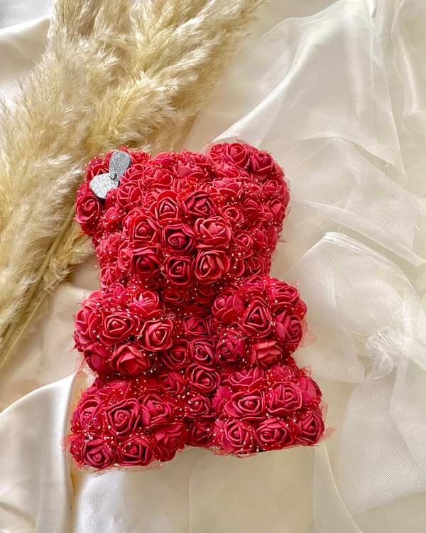 این خرس بامزه با ارتفاع حدود ۲۵ سانتیمتر، با بیش از ۱۰۰ گل رز فومی باکیفیت پوشیده شده که نه پژمرده میشن، نه رنگشون میره!