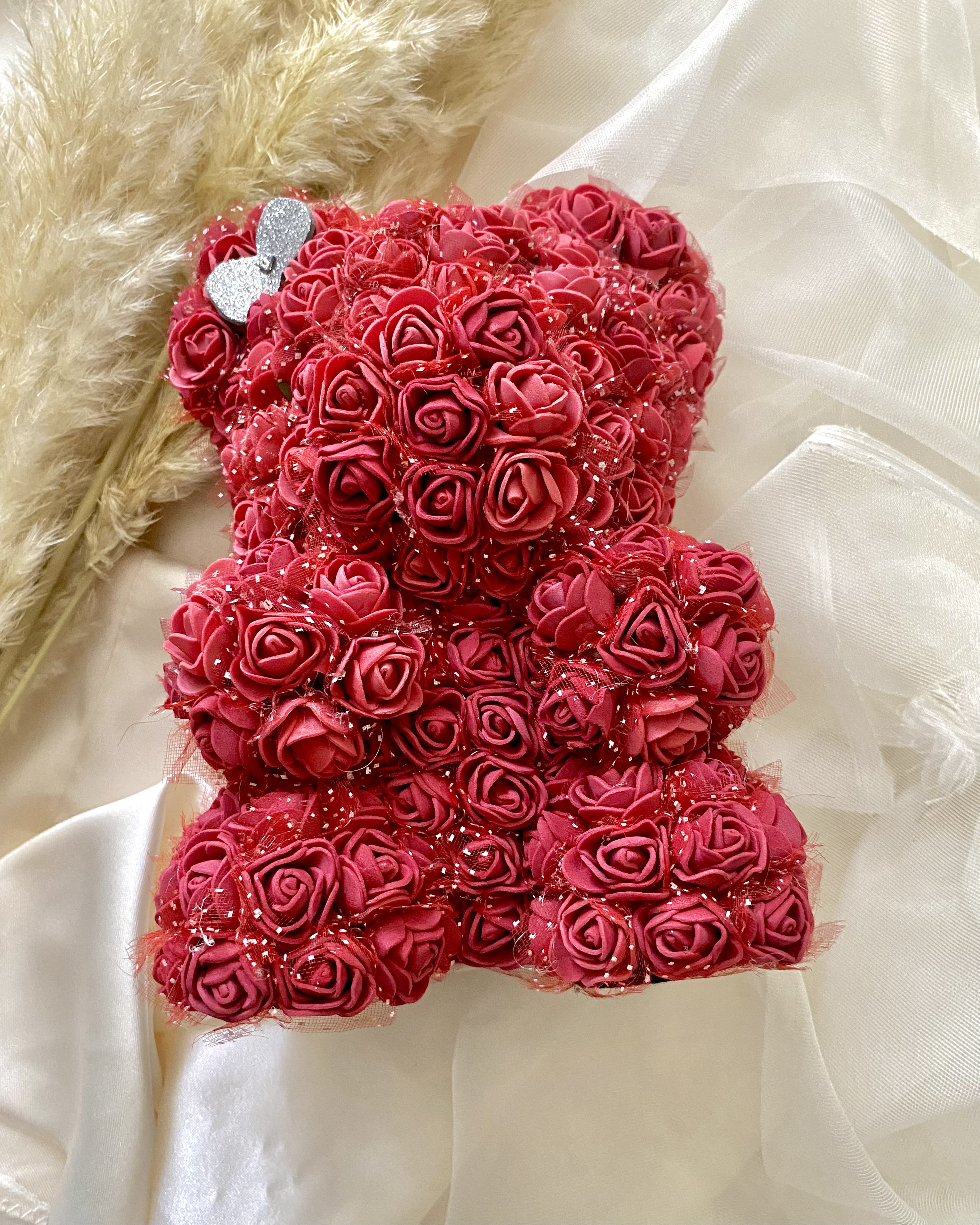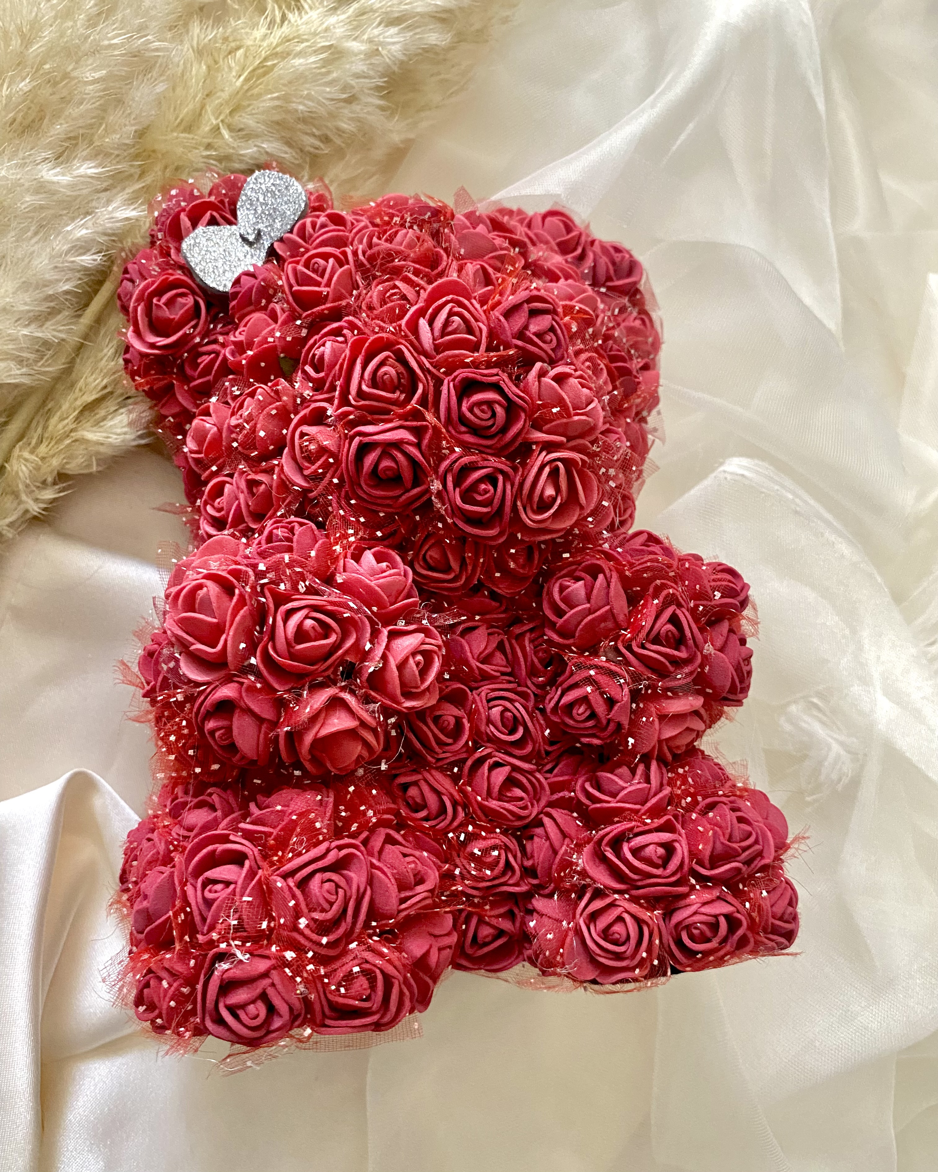 این خرس بامزه با ارتفاع حدود ۲۵ سانتیمتر، با بیش از ۱۰۰ گل رز فومی باکیفیت پوشیده شده که نه پژمرده میشن، نه رنگشون میره!